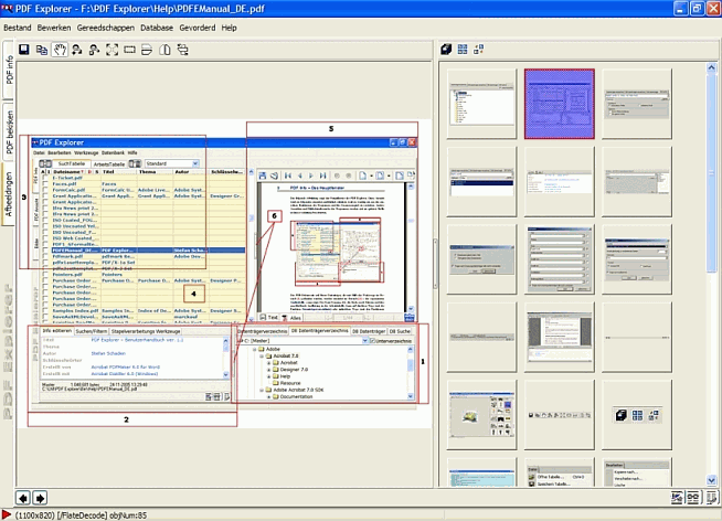 Links ziet u het venster om afbeeldingen te bekijken en te bewerken. Rechts ziet u het 'bekijkvenster' met de miniatuurafbeeldingen, welke in het document aanwezig zijn. Boven de beide vensters ziet u een balk met symbolen die het mogelijk maken de respectievelijke afmetingen van de afbeelding aan te passen. Het openen van de afbeeldingen in het 'bekijkvenster' en het aanpassen ervan kan door te dubbelklikken op de corresponderende miniatuurafbeelding in het gebied met de miniatuurafbeeldingen.