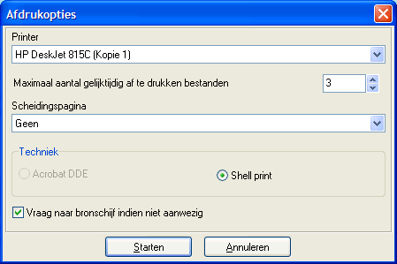 Voor het afdrukken kunnen we een extern programma gebruiken. Als Adobe Acrobat en/of Acrobat Reader door het systeem zijn gedetecteerd, kunnen we de methode gebruiken van Acrobat DDE die de DDE-techniek gebruikt (Dynamic Date Exchange). Het programma gebruikt de standaard optie dat annex is met de PDF extensie in het contextmenu van het systeem. Indien de afdrukopties nog niet zijn ingevuld (printer niet door het systeem gevonden of het externe programma is niet aanwezig voor het afdrukken van pdf bestanden), is de knop Starten nog grijs en functioneert niet.