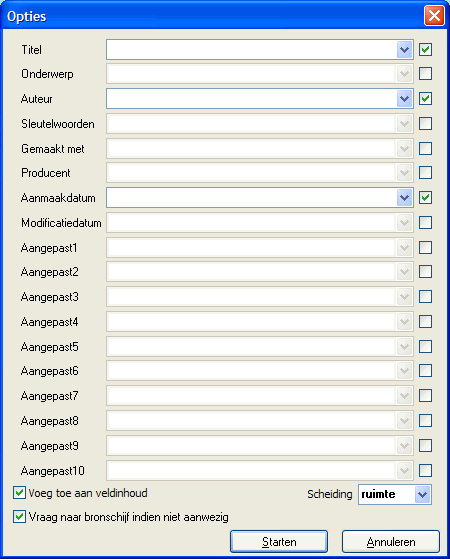 Om een informatieveld te kunnen bewerken, dient u het naastliggende vakje rechts aan te vinken. Aansluitend vult u de gewenste gegevens in het informatieveld in. Door bevestiging via de knop Starten wordt de bewerking gestart en worden alle geselecteerde bestanden van gelijke gegevens voorzien. Gedéactiveerde velden worden overgeslagen, zij blijven daardoor onveranderd.