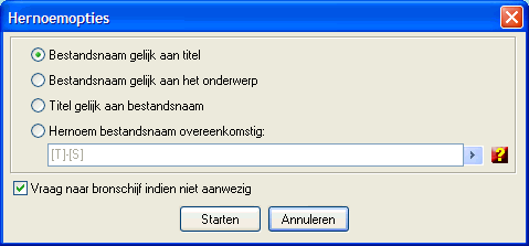 Deze optie stelt u in staat een document te hernoemen door de velden Titel en Bestandsnaam aan te passen of de titel gelijk te maken aan de bestandsnaam.