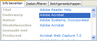 Deze functie biedt u de mogelijkheid het invoegen en bewerken van standaard informatievelden uit te voeren. Getoond wordt hierbij steeds het geselecteerde PDF document in de actieve grid. De door u gewenste wijzigingen worden tevens direct in de index aangepast en op de schijf - d.w.z. in het betreffende PDF document zelf.