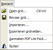Behalve het commando Sluiten om het programma te kunnen afsluiten, is in dit menu een functie aanwezig om de inhoud van de actieve grid op te slaan via Bewaar grid, om bijvoorbeeld een verzameling van documenten te creëren betrekking hebbende op eenzelfde onderwerp. Deze verzamelingen zijn toegankelijk via het commando Open grid die in de WerkGrid zijn geladen.