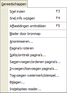 Het commando Snel inzien opent het bekijkvenster in PDF bekijken van het actieve document met toegang tot de mogelijkheid de informatievelden te bewerken in hetzelfde venster. Om de afbeeldingen aan actieve documenten te onttrekken, beschikt u over het commando Afbeeldingen onttrekken. Het commando Blader door bronmap opent de map waarin het actieve document zich bevindt in de Windows verkenner en selecteert het betreffende bestand. Dit is een zeer praktisch gereedschap om snel de plaats van een document te traceren. Het commando Anonimiseren. PDF-bestanden worden vaak aan andere personen doorgegeven en ongecontroleerd verbreid (o.a. via het internet). Het Anonimiseren is ervoor om alle meta-data (informatievelden) van PDF-documenten in een arbeidsgang te verwijderen. Het commando Pagina's roteren. Hiermede kunt u pagina's roteren/draaien, d.w.z. een of meerdere pagina's in een PDF-bestand 90° draaien, links om of rechts om of zelfs 180°. Op dezelfde wijze kunt u ze ook weer in de oorspronkelijke stand terugdraaien. Het commando Splits/onttrek pagina's is een functie, die toegepast kan worden om pagina's uit PDF-documenten te splitsen of te onttrekken. Met behulp van een krachtige regel-interpretator en een hoge verwerkingssnelheid kunnen PDF-bestanden in een mum van tijd worden onttrokken. Het commando Samenvoegen/ordenen pagina's is een functie, die toegepast wordt om uit verschillende PDF-bestanden een nieuw document samen te stellen c.q. te ordenen. Hiervoor geeft u een lijst op van PDF-bestanden en definieert u de regels, aan de hand waarvan de bestanden verwerkt moeten worden. Als uitkomst heeft u een nieuw PDF-document, dat uit meerdere bestanden is samengesteld. Het commando Invoegen/toevoegen pagina's is een functie, waarmee u individuele pagina's kunt invoegen in andere PDF-documenten. De plaats waar moet worden ingevoegd, kunt u zelf bepalen. De noodzakelijke instellingen doet in in het volgende dialoogvenster: Toevoegen watermerk/stempel is een functie, waarmee u tekst, een afbeelding of een geometrische voorstelling als "watermerk" in de pagina's van een PDF-document kunt invoegen. Daarmede kunnen b.v. documenten van een firmalogo worden voorzien of van opschriften, zoals "vertrouwelijk" of "concept", etc. worden voorzien, die daarmee onuitwisbaar in het PDF-document geïntegreerd worden. Bijlagen... Met deze functie kunt u bestandsbijlagen van PDF-bestanden openen, onttrekken, toevoegen en verwijderen. Bestandsbijlagen zijn een standaard functie van PDF-documenten, die het mogelijk maakt, iedere vorm van bestand - b.v. Tekst, Audio, Afbeeldingen, maar ook andere PDF-bestanden - aan een PDF-bestand te hangen. Dit kan toegepast worden, om enkelvoudige PDF-documenten van aanvullende informatie te voorzien (b.v. het originele bestand, waaruit het PDF-document werd samengesteld). Werd deze functie vanuit het contextmenu gestart, dan krijgen alle bestanden dezelfde bijlage. Instelopties Reader , is een functie waarmee u het programma kunt instellen, hoe u de PDF-documenten bij het starten wilt bekijken, b.v. die met Acrobat Reader zijn gemaakt. Hiertoe behoren o.a. instellingen van het readerprogramma, de pagina-layout, de pagina-indeling (enkele pagina of dubbele pagina, etc.), de vergrotingsfactor of de als eerste aangegeven pagina. U kunt dus vooraf precies instellen hoe u uw PDF-bestand (en) op het scherm wilt bekijken. |