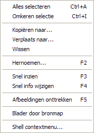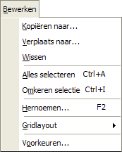 Dit menu bevat de commando's om documenten te kunnen kopiēren, verplaatsen, wissen of hernoemen van alle in de grid aanwezige actieve documenten. Deze functies zijn toepasbaar op de geselecteerde documenten of anders op het actieve document. Bovendien is er ook nog de selectiefunctie. Alles selecteren selecteert alle documenten in de actieve grid en Omkeren selectie keert de gemaakte selectie om en zo u wilt vice versa. Het commando Gridlayout opent een submenu dat het mogelijk maakt een nieuwe grid aan te maken met een indeling naar eigen wens via de opdracht Creēer nieuwe. U vindt hier tevens de commando's Wis huidige en Bewerk huidige, waarmee u de door u zelf samengestelde grid eventueel kunt aanpassen. In het menu is ook een mogelijkheid aanwezig om een aantal programma-opties in te stellen via de opdracht Voorkeuren. |