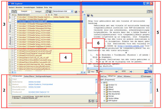 De volgende afbeelding toont het hoofdscherm van PDFE met de PDFInfo tab (links boven) geselecteerd. De volgende uitleg zal enige belangrijke gebieden van dit scherm belichten.