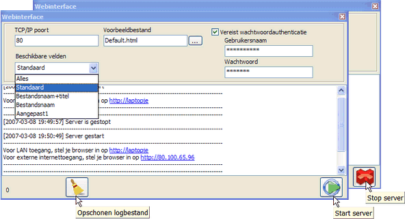 De beide knoppen onderaan het venster zijn resp. voor het Opschonen logbestand en Start/Stop server.