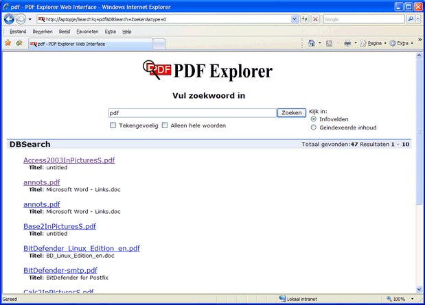 Met deze optie kunt u zoeken naar alle documenten met een PDF verwijzing in de database van PDF Explorer door de webbrowser op het interne netwerk te starten of via het internet naar een externe server.