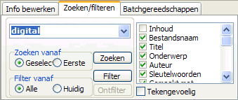 Tenslotte nog een bijzonderheid van de zoekfunctie: Wanneer in de keuzelijst van de te doorzoeken informatievelden de optie Inhoud geactiveerd is, wordt uitsluitend de tekstinhoud van alle aangevinkte PDF bestanden doorzocht. Het doorzoeken van de informatievelden wordt daarbij automatisch gedeactiveerd. Op de wijze wordt ook binnen de functie Zoeken/filteren een zoekactie naar geïndexeerde inhoudswoorden mogelijk, die u reeds in samenhang met de functie DBzoeken hebt leren kennen. Let er echter wel op, dat een zoektocht naar inhoudswoorden eerst dan mogelijk is, wanneer vooraf een automatische indexering van teksten van alle PDF bestanden is doorgevoerd (met behulp van de functie Indexeren tekstwoorden in de batchgereedschappen).