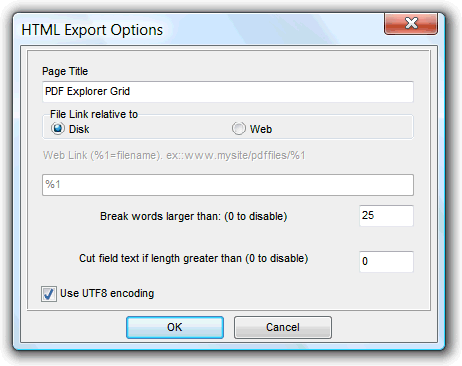 Metadata is Unicode encoded in the PDFE database. It's best to set the Use UTF8 encoding option if there is the possibility that fields to export contain characters from a different character codepage than the system active one, or there is the possibility these characters will look scrambled in the generated html.