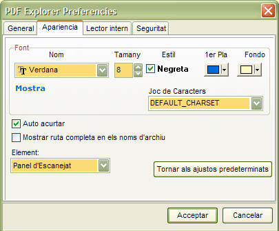 Triem la finestra que es vol configurar en Item i especifiquem les caracteristiques del tipo de lletra. Per a que PDFE puga mostrar caracters no ANSI deu utilisar una font TrueType i unicode en sistemes operatius com Win9x. El conjunt de caracters (charset) de la font deu correspondre en la majoria dels casos en el caracter del teclat.