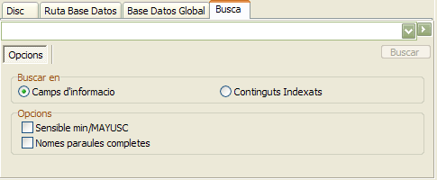 Els dos tipos de busca ens permeten especificar si els documents trobats contenen les paraules de forma completa o parcial, a traves de l'activacio o desactivacio de la casella Nomes paraules completes respectivament. La primera opcio de busca, Camps d'informacio, ens permet la posibilitat d'atendre o no a la capitalisacio de les lletres (sensible a MAYUSCULES/minuscules) utilisada en l'expressio booleana.