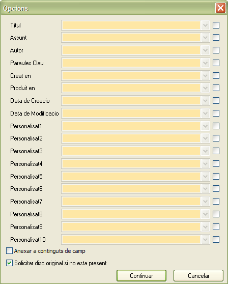 Esta ferramenta permet editar un o varios camps de modo que tots els documents somesos a l'operacio queden en eixe o eixos camps iguals. Alguns dels camps mes obvis son Autor , Data de Creacio i Data de Modificacio . De qualsevol modo, tots els camps estandar estan accesibles.