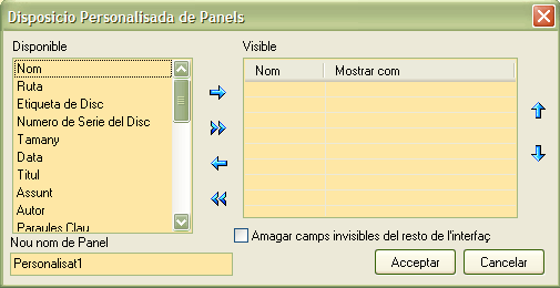 En ell definim quins items estaran presents en la finestra activa. Per aço es prou en colocar els triats en la llista Disponible fins la llista Visible , o viceversa, utilisant els botons presents entre les dos llistes, i ordenar-los en els botons de l'esquerre de la llista Visible . Els que finalment estiguen en la llista Visible , seran els que estaran visibles en el panel si triem el disseny, al que li podem donar-li un nom utilisant la caixa Nom de disseny de Panel per a identificar-lo millor en el selector de dissenys.