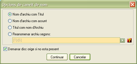 I este es el seu panel de configuracio. En ell triem l'operacio a efectuar i si volem que el programa solicite la presencia del disc de soport (en el cas de renomenar el ficher) quan este no es trobe present.