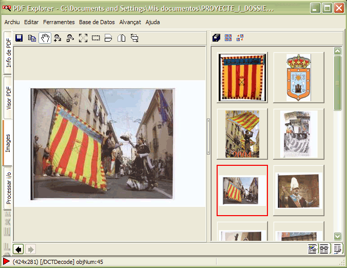 A l'esquerre tenim l'area de visualisacio i edicio per a exportar les images. A la dreta la visualisacio de les miniatures i l'exportacio de totes les images presents en el document i a les que el PDFE conseguix accedir. Entre elles es troba una barra de redimensionament que permet dimensionar concurrentment cada una d'estes arees. L'apertura d'images en l'area de visualisacio i edicio es fa a traves de doble clic apuntant sobre la miniatura de l'image que es preten visualisar.