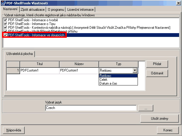 Popisná data standardních PDF souborů jsou v nabídce obsažena a lze je snadno aktivovat do uživatelských sloupců z PDF-ShellTools - Vlastnosti.