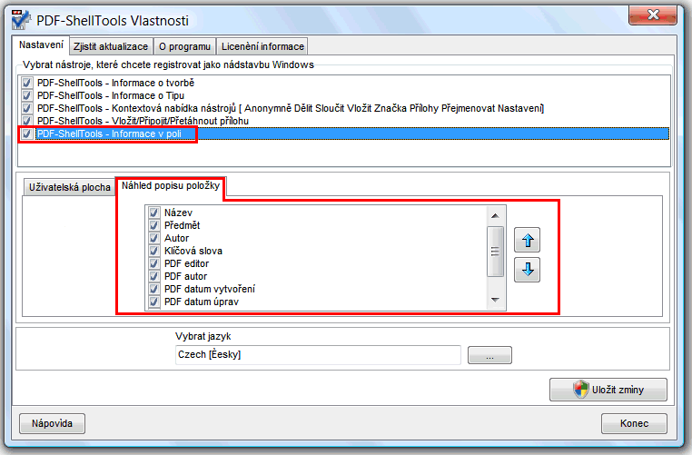 Jako u sloupcových informací jsou popisná data snadno dostupná, a k tomu, aby byla zobrazena standardní popisná data v kontextovém menu, nastavíme je v PDF-ShellTools - Vlastnosti. Prosím, postupujte obdobně jako u sloupcových informací, postup je totožný.