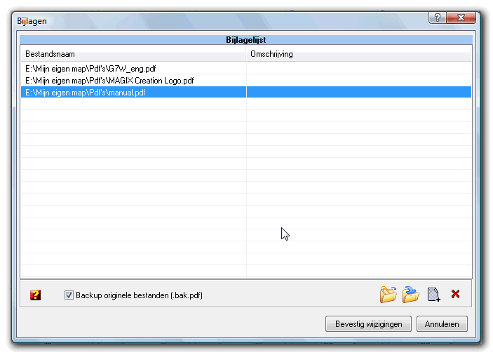 De geselecteerde bijlagen worden overgenomen (d.w.z. bestandsbijlagen worden toegevoegd, verwijderd of veranderd), wanneer u op de knop Bevestig wijzigingen klikt.
