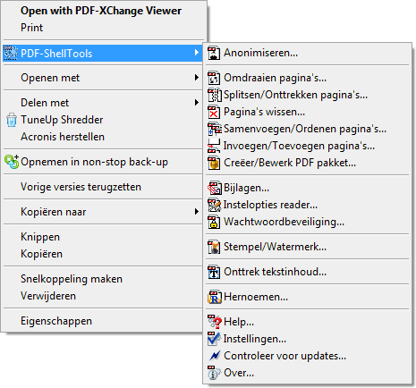De via het Shell contextmenu oproepbare tools, waarvan het menu verschijnt na met rechts op een bestand te hebben geklikt of na een rechtse klik op een in de Windows Verkenner geselecteerd bestand, opent zich via de keuze PDF-ShellTools een menu voor de diverse menu-items.