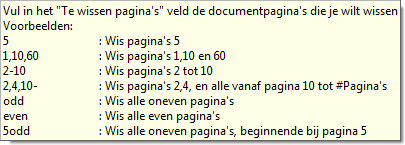 Het te wissen pagina's veld kan worden opgeroepen via het gele vraagteken rechts. Beweeg de muiscursor erover om de hints te zien zoals hieronder wordt getoond.