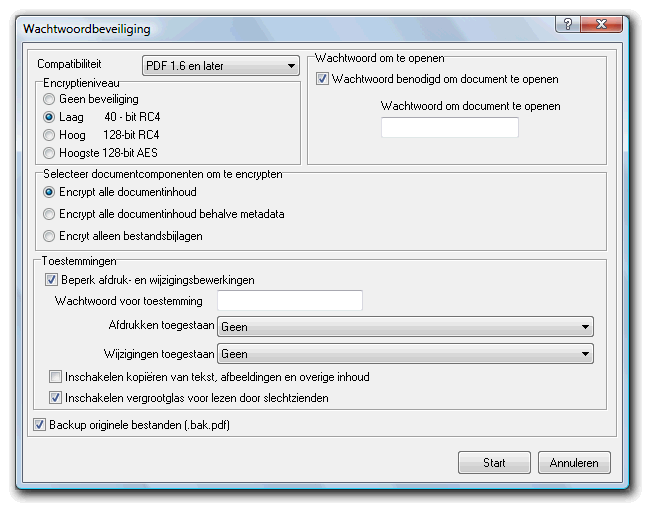 Het Encryptieniveau bepaald het type algoritme dat wordt gebruikt voor het encrypten van uw PDF-document. Hoe hoger het niveau, hoe beter uw bestanden worden beschermd. Selecteer Geen beveiliging, wanneer u de wachtwoordbeveiliging wilt verwijderen uit reeds beschermde bestanden.