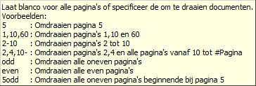 | [Pages=] | Lijst met om te draaien pagina's, zie bovenstaande voorbeelden voor de regeldefinities. Default voor alle pagina's. |