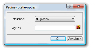 Het Rotatiehoek item biedt de mogelijkheid de hoekverdraaiing aan te geven voor de pagina's en in het Pagina's-veld kunnen de betreffende pagina's worden aangegeven voor de omdraaioperatie. Laat de velden leeg om alle pagina's om te draaien of specificeer de pagina's als volgt: